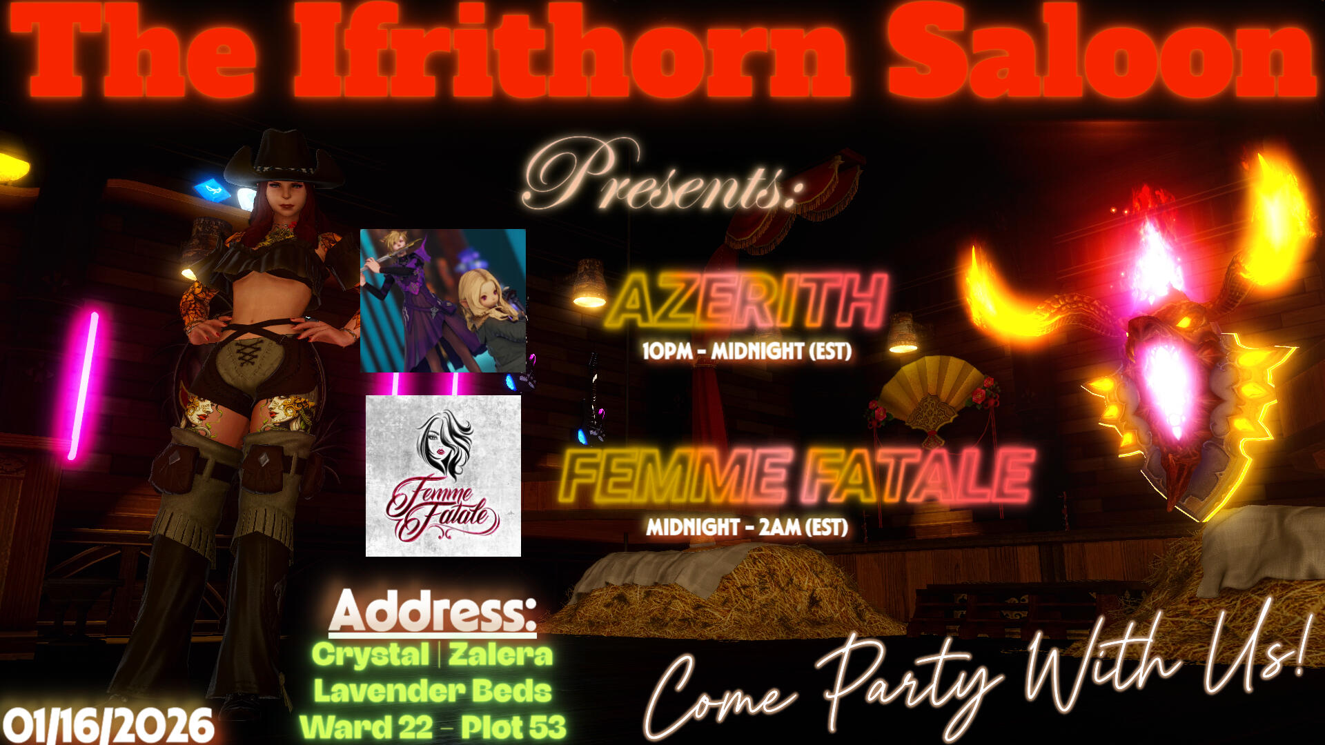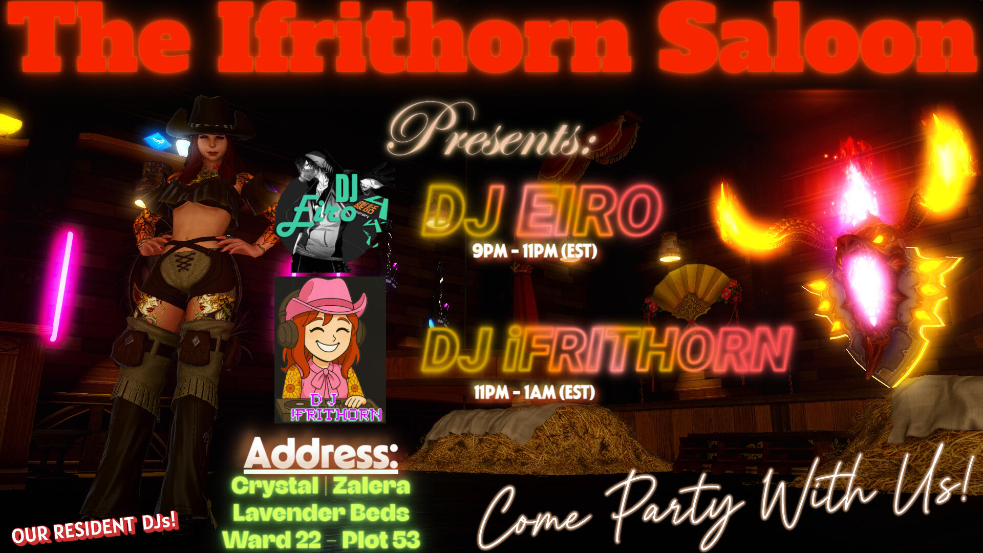We often get asked..."What Are Y'all About?"Howdy there, partner! We are a Honkey Tonk located in the heart of the woods near Gridania inside of a small cottage. During the day, we are host to select group of outlaws and adventurers known as The Wild Bunch that seek to collect on bounties. After the sun goes down, we turn tail & burrow into the Honky Tonk part of it, gettin' the joint jump hotter than the fire from the Seven Hells. We invite storytellers, musicians, dancers, theatre troupes, and many other types of unique entertainers from every corner of Eorzea to come & perform for our bar-going family. We also enjoy having gamblers and game players in our upstairs area for an array of pool, darts, and card games, but we don't have much room upstairs for much more other than that. We bring in all sorts of folks from every walk of life. All are welcome at our place! We wanna know your name & hear your story, so don't hesitate to pull up a chair or a stool to tell us your tale! We got plenty of food as well as many kinds of spirits, wines & mixed drinks for you to delight in. We are most famous for our unique & exotic whiskey known as Ardbert. Our menu is everchanging, and will continue to evolve over time.While we can all get a bit rowdy at times, we ask that you respect your fellow patron while spendin' time here. Always stay humble 'n kind! It's generally good advice in life, and while we ain't one to talk politics or religions (it's not allowed), bein' kind and humble is something we preach here a lot. Kindness goes a long way! Our golden rule is to treat others as you wish to be treated. If you want to be respected and well-liked, then you need to be the same way towards others in kind. Maybe you'll make a friend along the way! Failure to keep our little space drama-free will result in expulsion and you will be put on a Do-Not-Serve Blacklist to all of our staff. Don't make our bouncers have to get their hands dirty 'n use their boots for kickin' up more than wind on the dance floor!Thank you for checkin' out our fine little establishment! We hope to see y'all there!